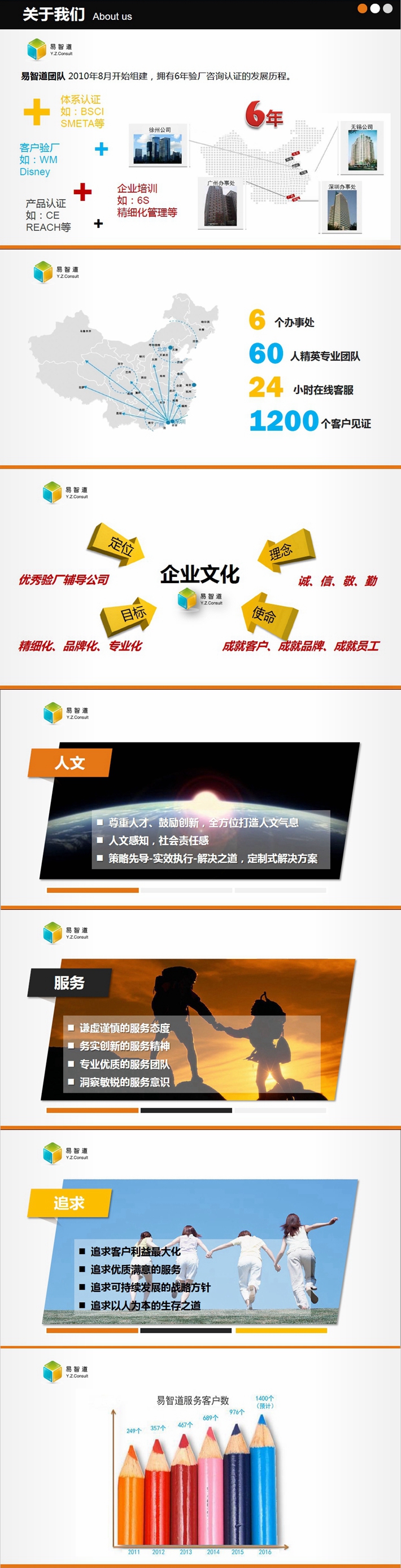 • 无锡易智道企业管理咨询有限公司是经无锡市工商局批准注册成立具有独立法人资格的,是专业从事企业管理咨询服务、认证咨询辅导及咨询系统集成的科技开发型企业。一直致力于帮助外贸加工企业规避供应链风险,确保外贸业务的可持续性。企业拥有从客服、市场、项目管理、售后、行政管理等部门,公司的顾问均聘请自各大公正行以及其他专业的辅助机构,都具备专业的技能,丰富的验厂辅导经验,能在短时间内转对不同的工厂以及不同审核客户的要求“量身定制”一套成本低、简单可行的解决方案。